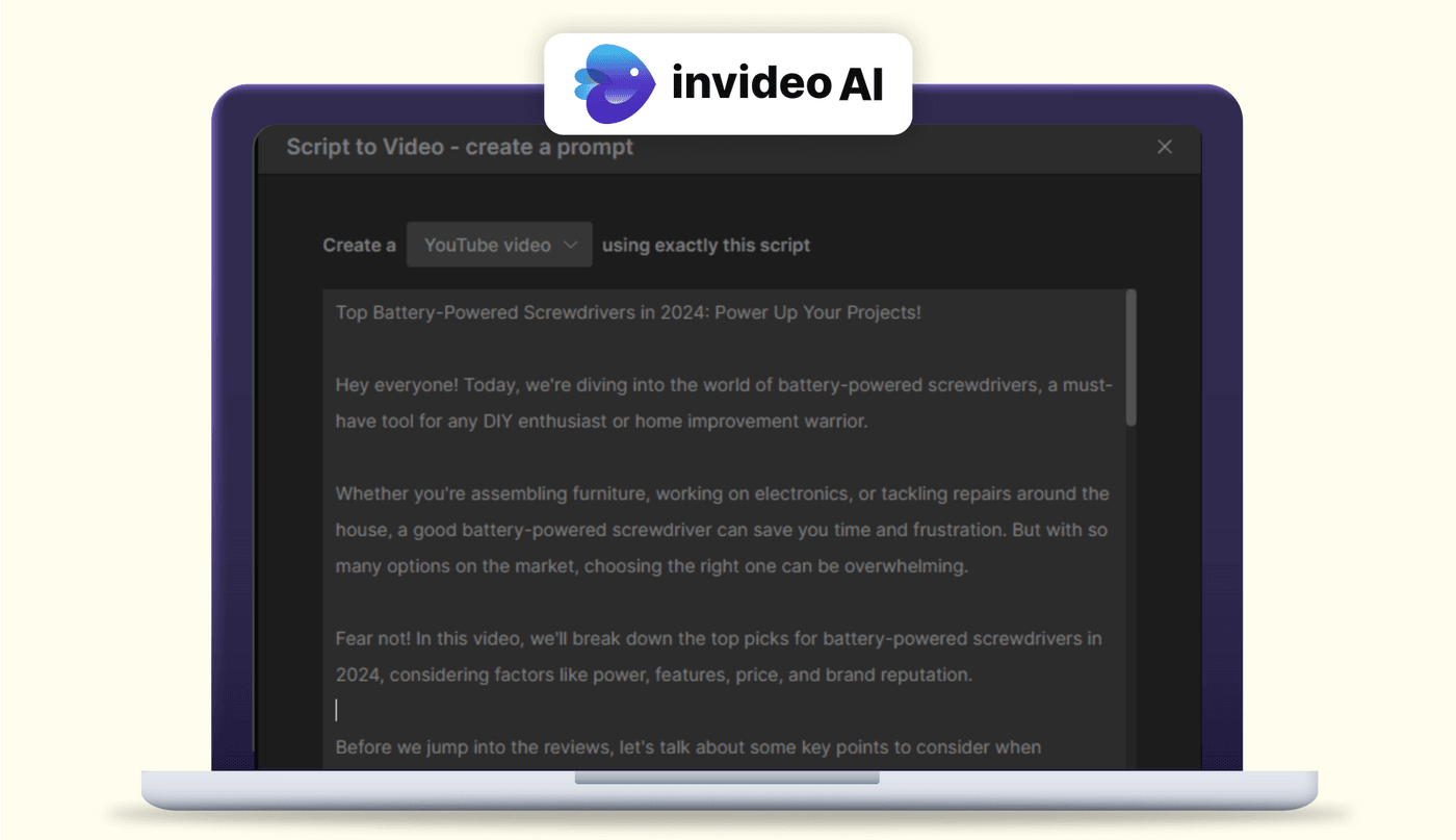 Remember, the easiest way to review your script is by actually watching a video with it. So jump into invideo AI, generate a complete video from your script, and just polish from there! Our user-friendly tools, plus all the stock footage, music, and effects you'll ever need, make it happen.