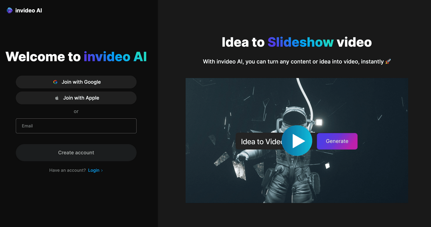 Step 1: Get your free invideo AI account. Super easy – email, Google, or Apple sign-in, your choice.