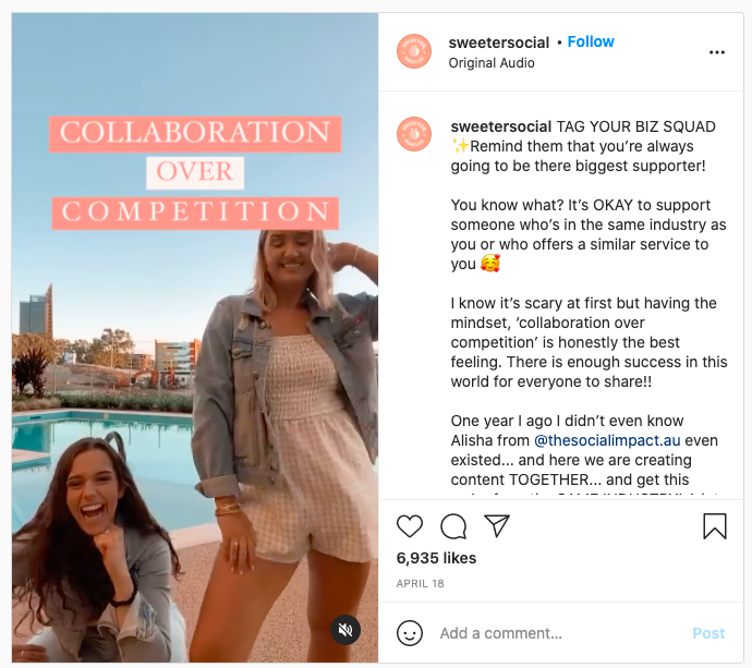 This one’s nice to tag your biz squad: Instagram is teeming with brands. So what makes yours unique? If you’re solving a problem within an industry, you’ve created something completely original, or you have a brand aesthetic that is completely on-trend right now — this is your chance to show it off. Keep your followers up to date with what’s happening by giving them a peek behind the scenes. Everyone likes to understand how things pan out in real-time. You can try and answer questions like what your average day looks like, your current projects, or you can even consider a teaser Instagram Reel to hint at upcoming work that your followers can expect to see soon.3. Tell your brand story