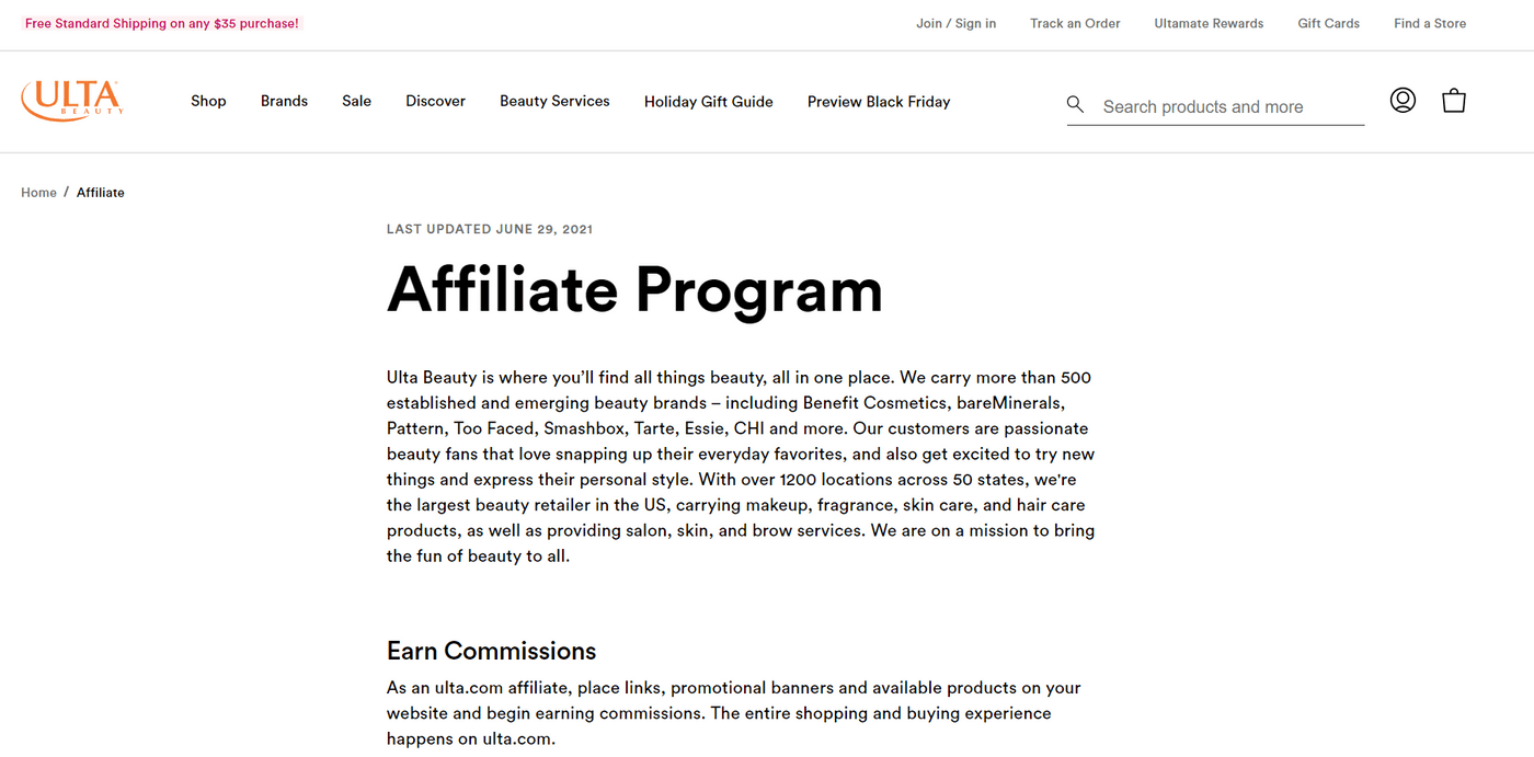 Got your audience in the beauty niche? Ulta's affiliate program might be the perfect affiliate marketing program for you if your audience is interested in a mix of high and affordable skincare, makeup, or personal care products. The commission rates range from 1% to 5%, which might seem slightly lower, but the brand has an extremely strong market presence.