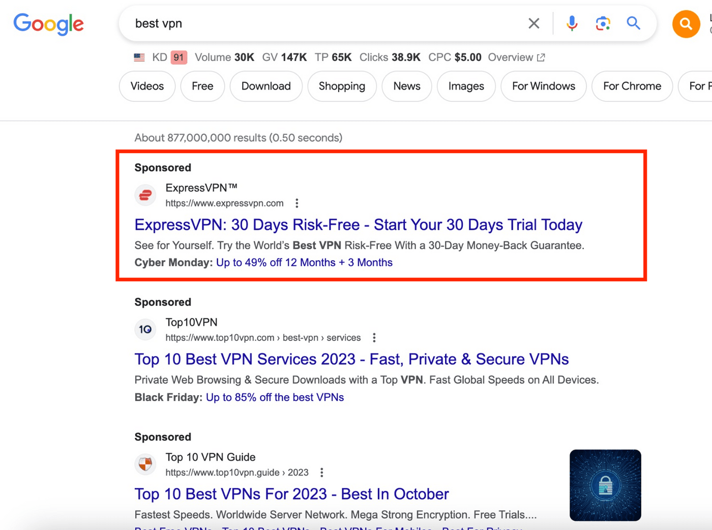 This website has put together a list of the top 10 VPN options (with which it has partnered to market these products through affiliate marketing). Since it’s running ads for the keyword “best VPN”, it appears in the top search results for the same.