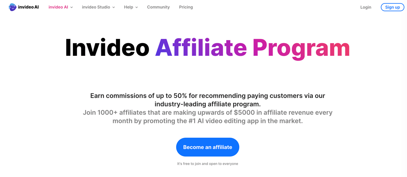 Join a thriving community of over 1000 affiliate partners with invideo AI and get an opportunity to make over $5000 every month. The invideo AI program provides up to 50% commission on every paying customer you bring to the platform as an affiliate. The figure comes to flat 25% on yearly plans (ranging between $240 and $576), and up to 50% on monthly plans.